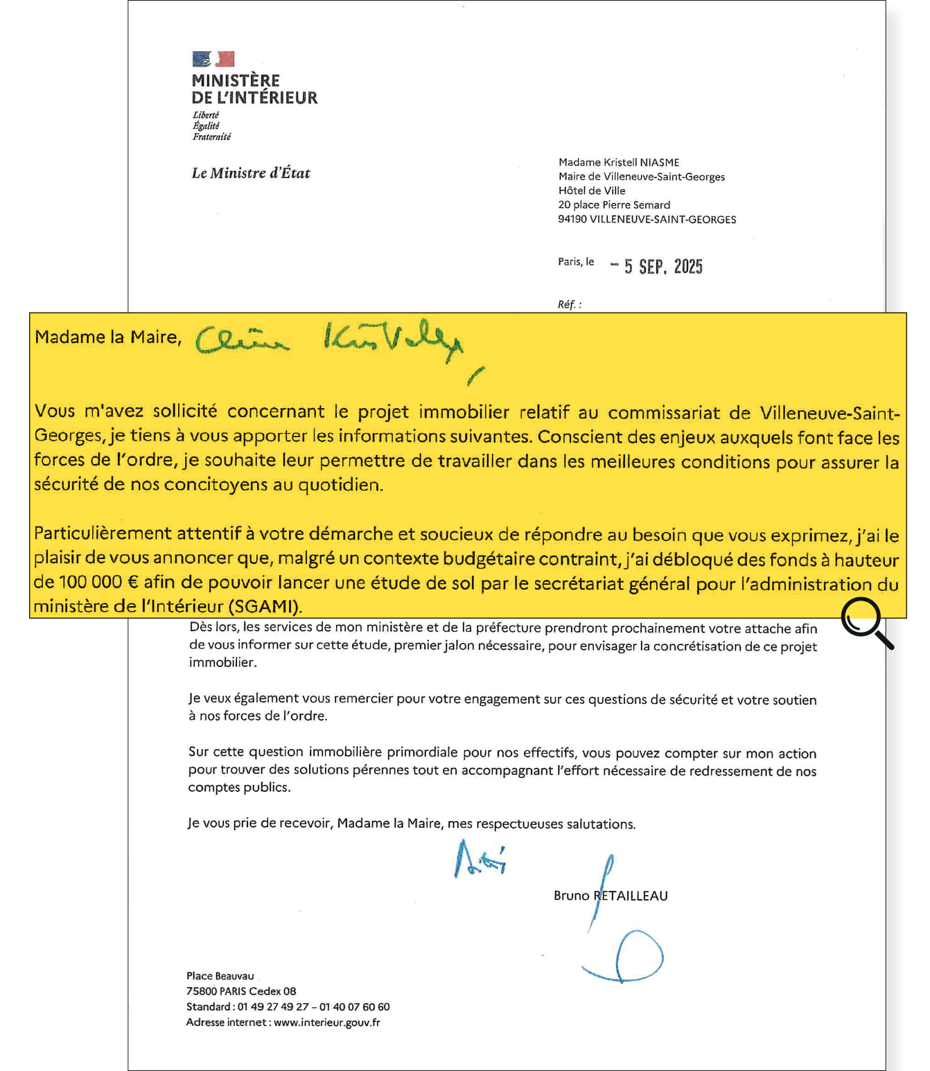 - 5 septembre 2025 : Courrier du Ministre de l'Intérieur qui confirme le soutien financier de l'État à Madame le Maire