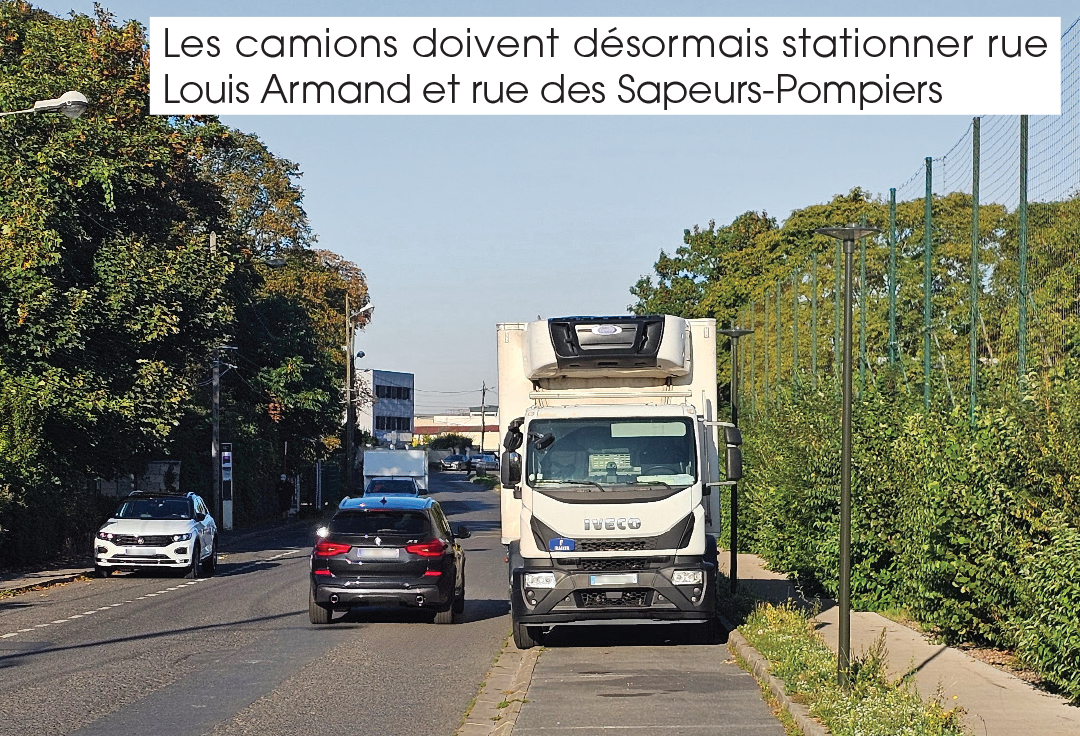 Des chauffeurs routiers de sociétés étrangères à la Ville ont pris la mauvaise habitude d'utiliser nos rues comme aires de stationnement ! Cela cause des nuisances et de l'insécurité. Pour mettre fin à cette situation, depuis le 1er octobre 2025, un arrêté municipal oblige les véhicules de plus de 3.5 tonnes et de plus de six mètres de long à stationnement exclusivement rue Louis Armand (secteur Pompadour) et rue des Sapeurs-Pompiers.