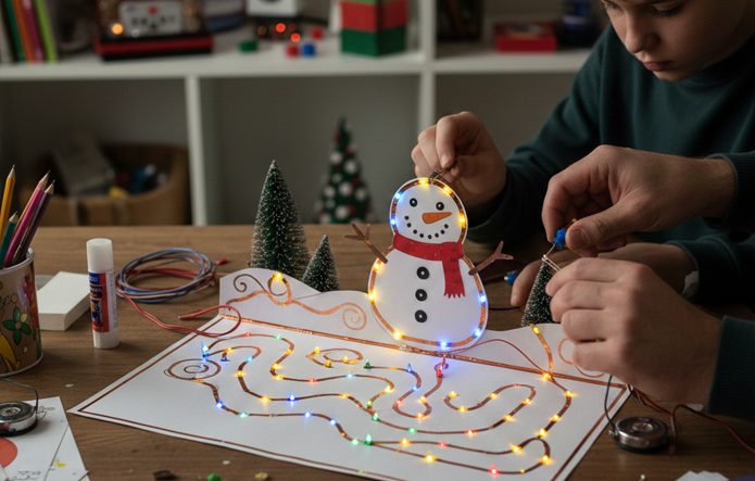 Donne vie à un bonhomme de neige en créant un circuit lumineux ! Une activité ludique et créative pour s’initier à l’électronique tout en laissant libre cours à ton imagination !