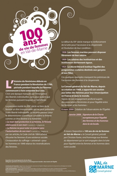 Réalisée par l'Observatoire de l'égalité du Conseil général du Val-de-Marne, cette exposition revient sur 100 ans d'histoire et de vies de femmes dans le département, au travers de sujets comme le droit à l'éducation, au travail, à l'action ou à la revendication. Prêt gracieux des Archives départementales du Val-de-Marne.